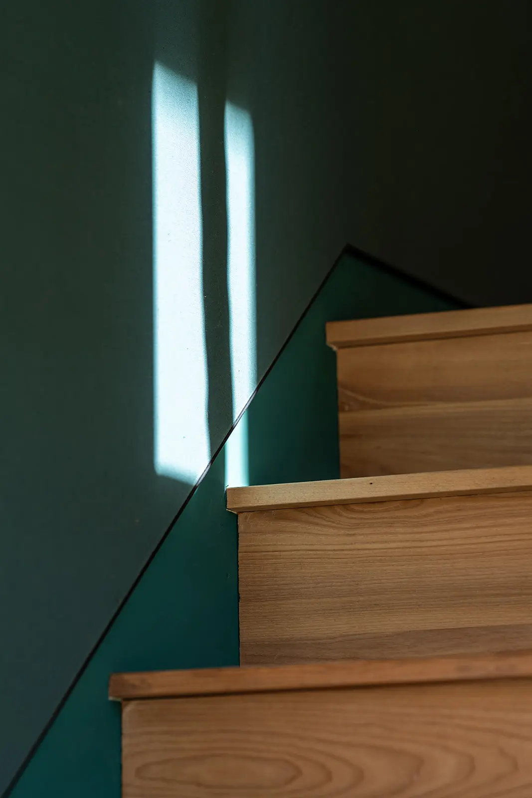 La refonte du franchissement vertical a induit la création d’un hall intermédiaire et le déplacement de la porte d’entrée principale qui a été intégrée à la porte de garage