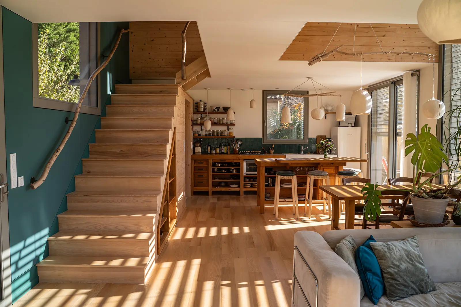 Construite selon un système « tout bois » avec ossature et isolation en laine, la maison vise une empreinte écologique et des coûts d’usage très faibles. Cette technique, associée à de larges ouvertures permettant de bons apports solaires, positionne la maison dans la catégorie « bio-climatique ».