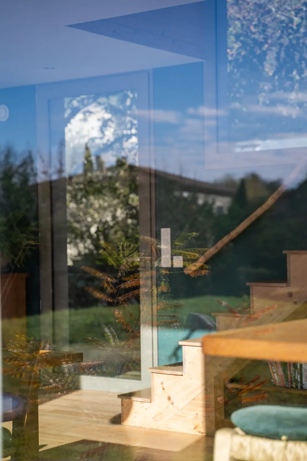L’extension Sud vient créer un patio, sa couverture devient un solarium accessible depuis la suite principale.